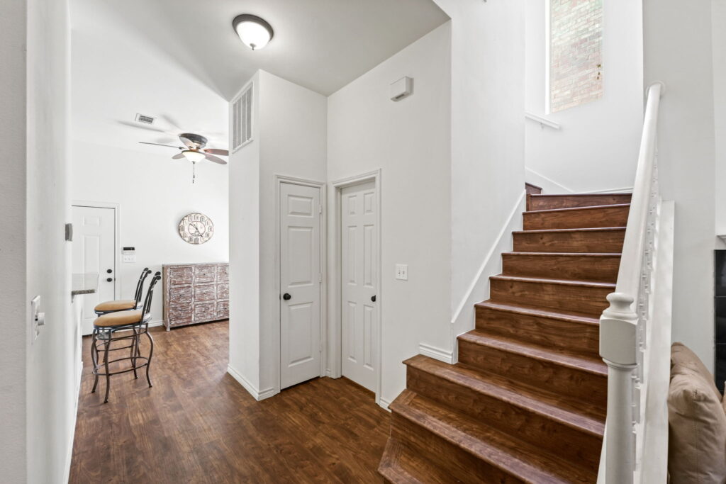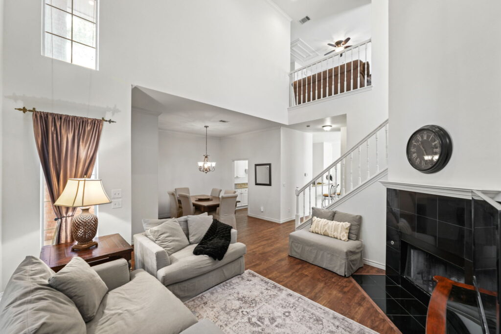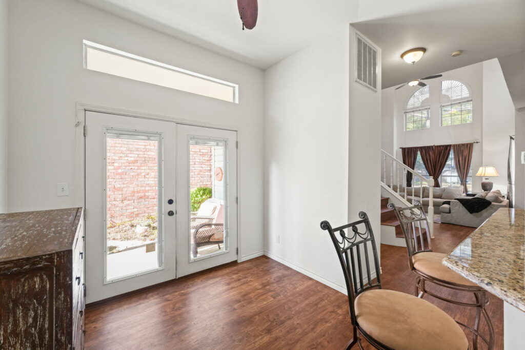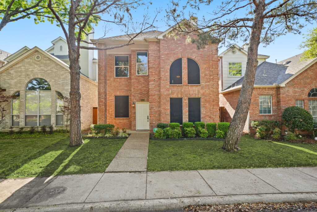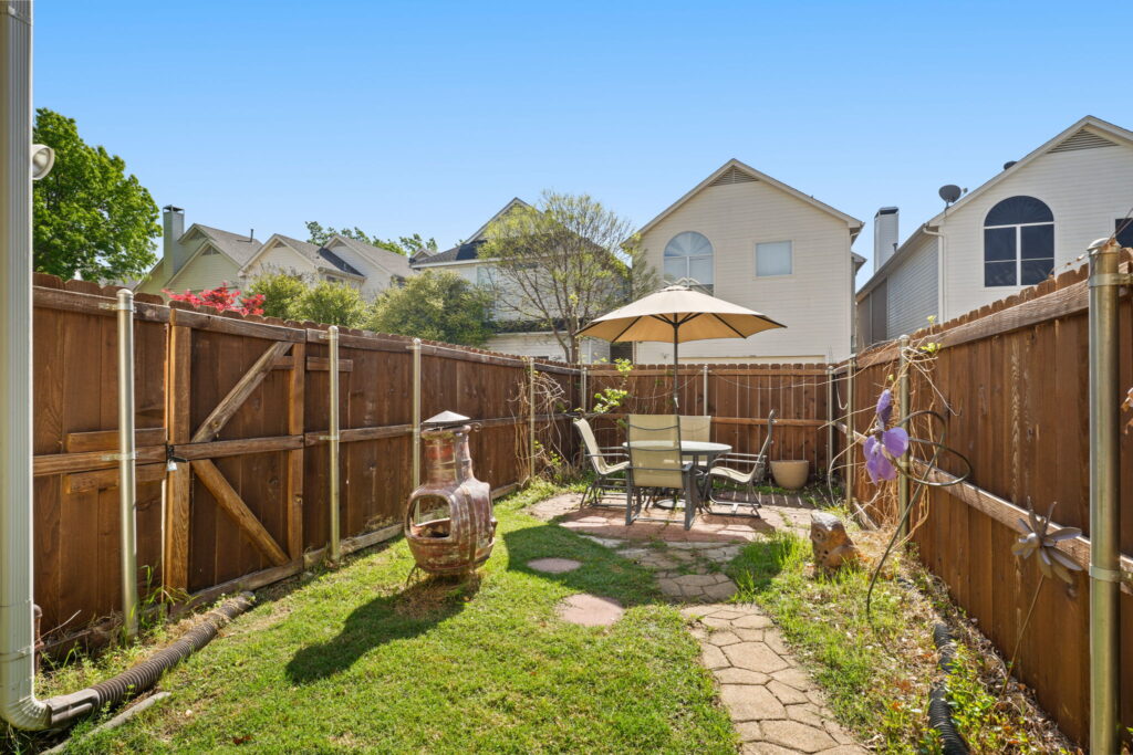 Attractive zero-lot line home with a cozy covered back patio & a private driveway to a 2-car garage located in the quiet Preston Village community. This home features tile floors and luxury vinyl planking, high ceilings and abundant natural light. The living room and formal dining room are open to the kitchen and breakfast area. The kitchen has granite countertops, a breakfast bar, and plenty of cabinet space. The backyard area features covered sitting area , large storage closet and a grassy area. Upstairs boost a second living area, 2 bedrooms and 2 full bathrooms. The roomy primary bedroom ensuite bathroom has large walk-in shower, separate tube, plenty of storage and double sinks. The HOA includes front yard maintenance. Zoned for Plano ISD!